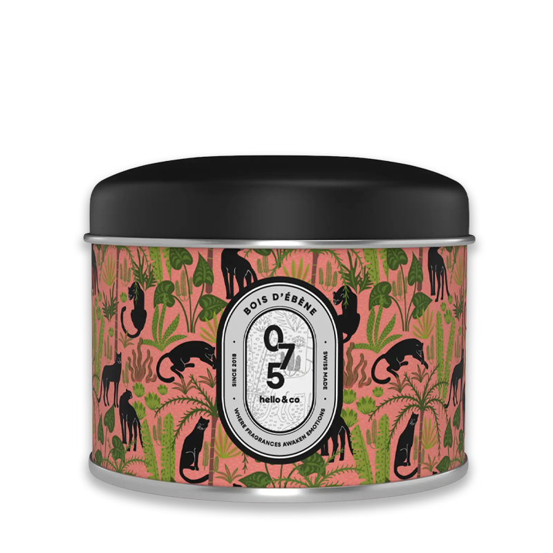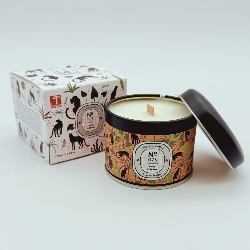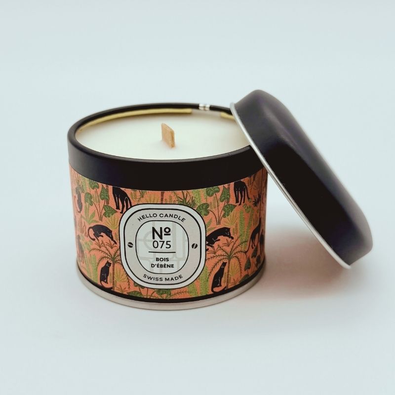 Deqore et embaume ton intérieur avec une bougie parfumée créée et fabriquée en Suisse par Hello Candle de façon artisanale. Ces bougies sont naturelles (cire de soja garantie sans OGM) et avec un design unique (métal avec étiquette et carton illustrés).
