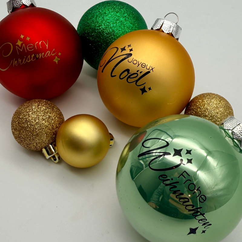 Les boules de Noël en verre sont gravées au laser avec une finition de peinture à l'intérieur de la boule pour capturer l'esprit de Noël et créer des souvenirs inoubliables. Chaque boule est personnalisable avec le logo ou le texte de ton choix. Pour une demande spécifique, n'hésite pas à nous demander une offre ou par e-mail à info@deqore.ch.