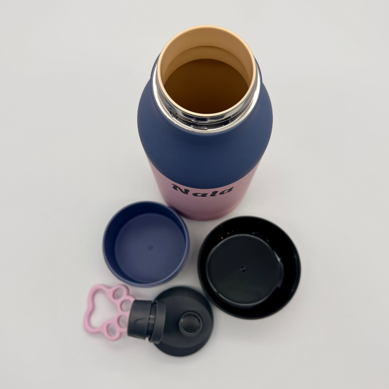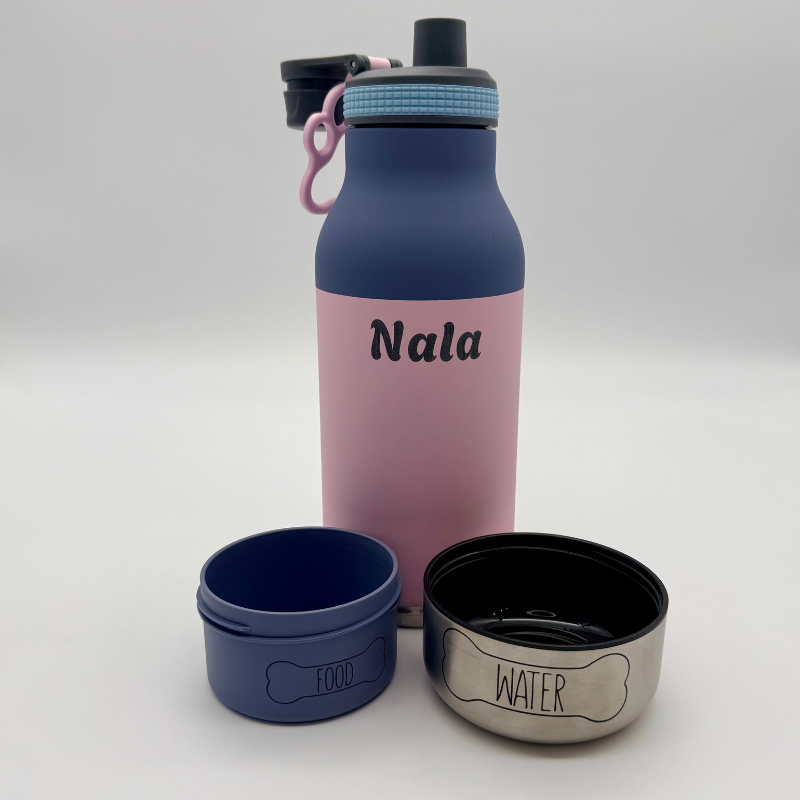 - Bouteille 3-en-1 : compartiment boisson + bol à eau + récipient à snack